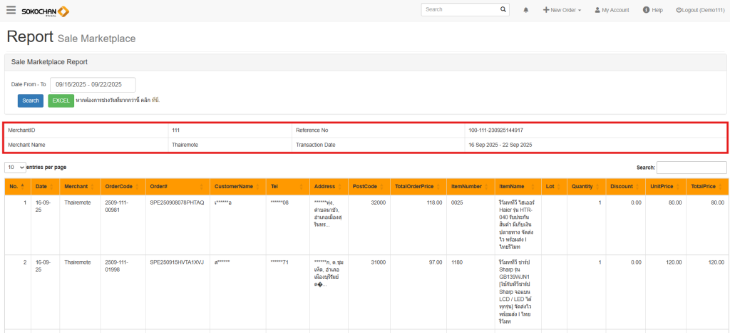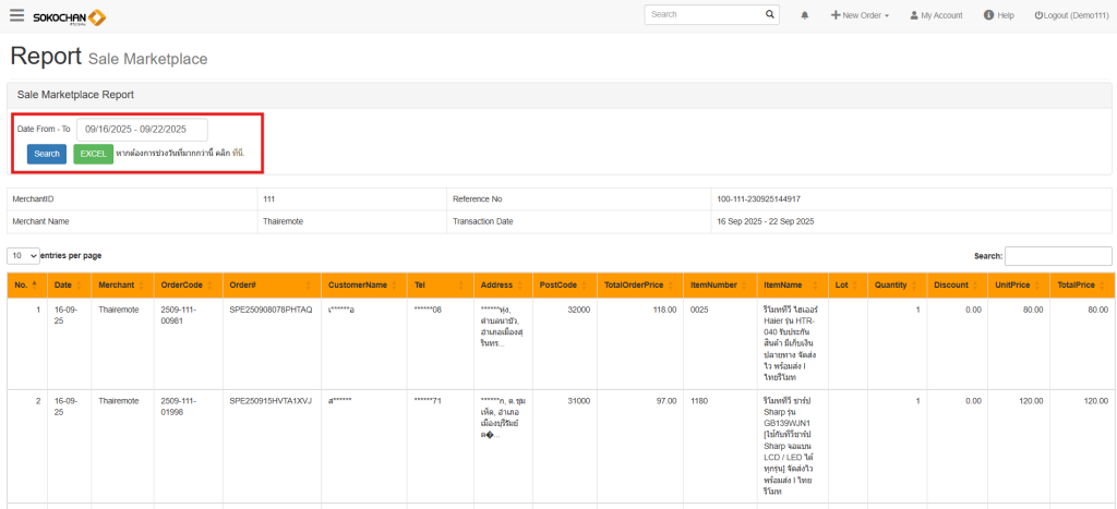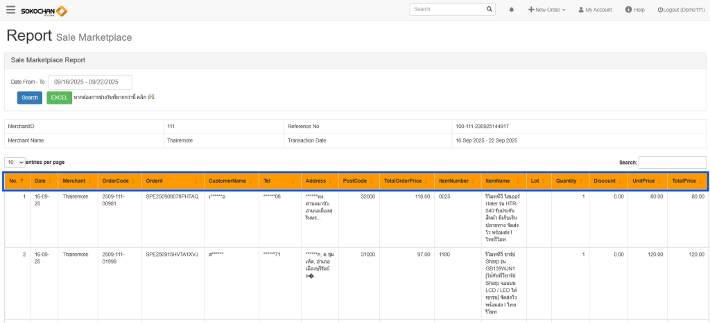 | Order Code | เลขออเดอร์ Soko | เลขออเดอร์ที่ถูกสร้างในระบบ Sokochan |