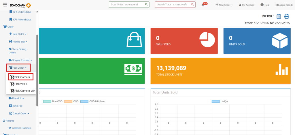 กดปุ่ม Pick Order และเลือก Pick Camera WH เพื่อเข้าสู่กระบวนการสแกนนับจำนวนสินค้าก่อนสินค้า