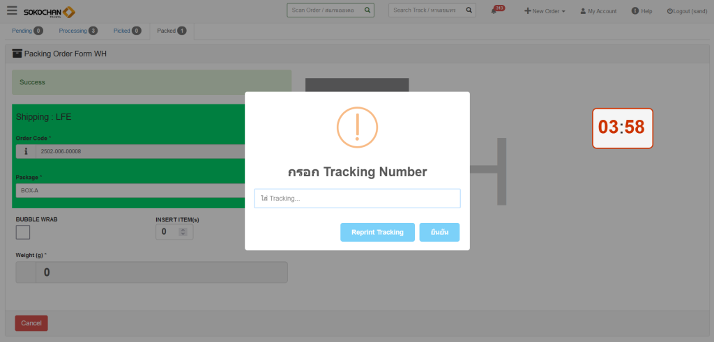 เมื่อสแกนเลข Tracking Number จากใบปะหน้าที่ขนส่งจะจบกระบวนการแพ็คออเดอร์และกลับมาที่หน้าสแกนเลขออเดอร์ โดยสามารถสแกนเลขออเดอร์ถัดไปเพื่อแพ็คออเดอร์ถัดไปได้เลย