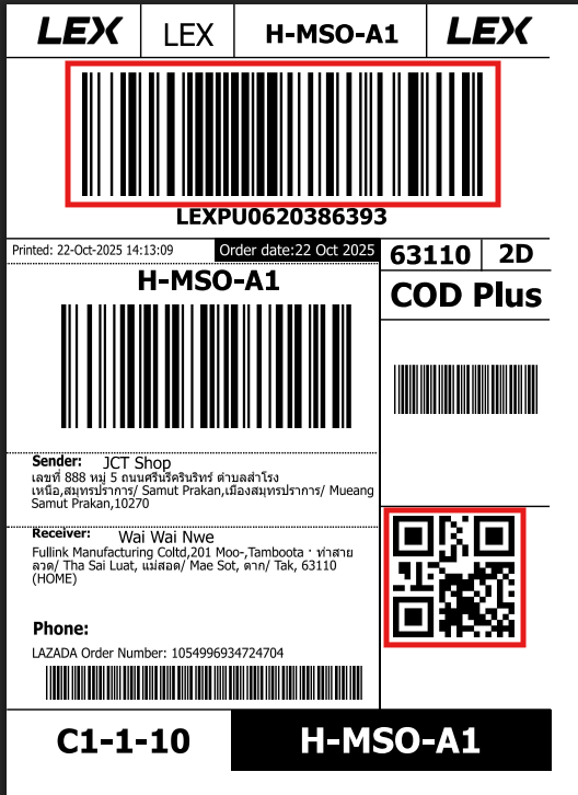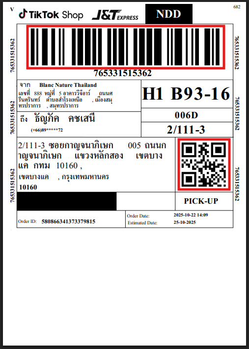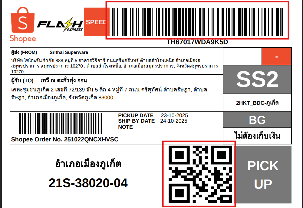 ตัวอย่างใบปะหน้า ส่วนที่เอาไว้สแกนเลข Tracking (วงกรอบสีแดงคือส่วนที่เอาไว้สแกนเลข Tracking)